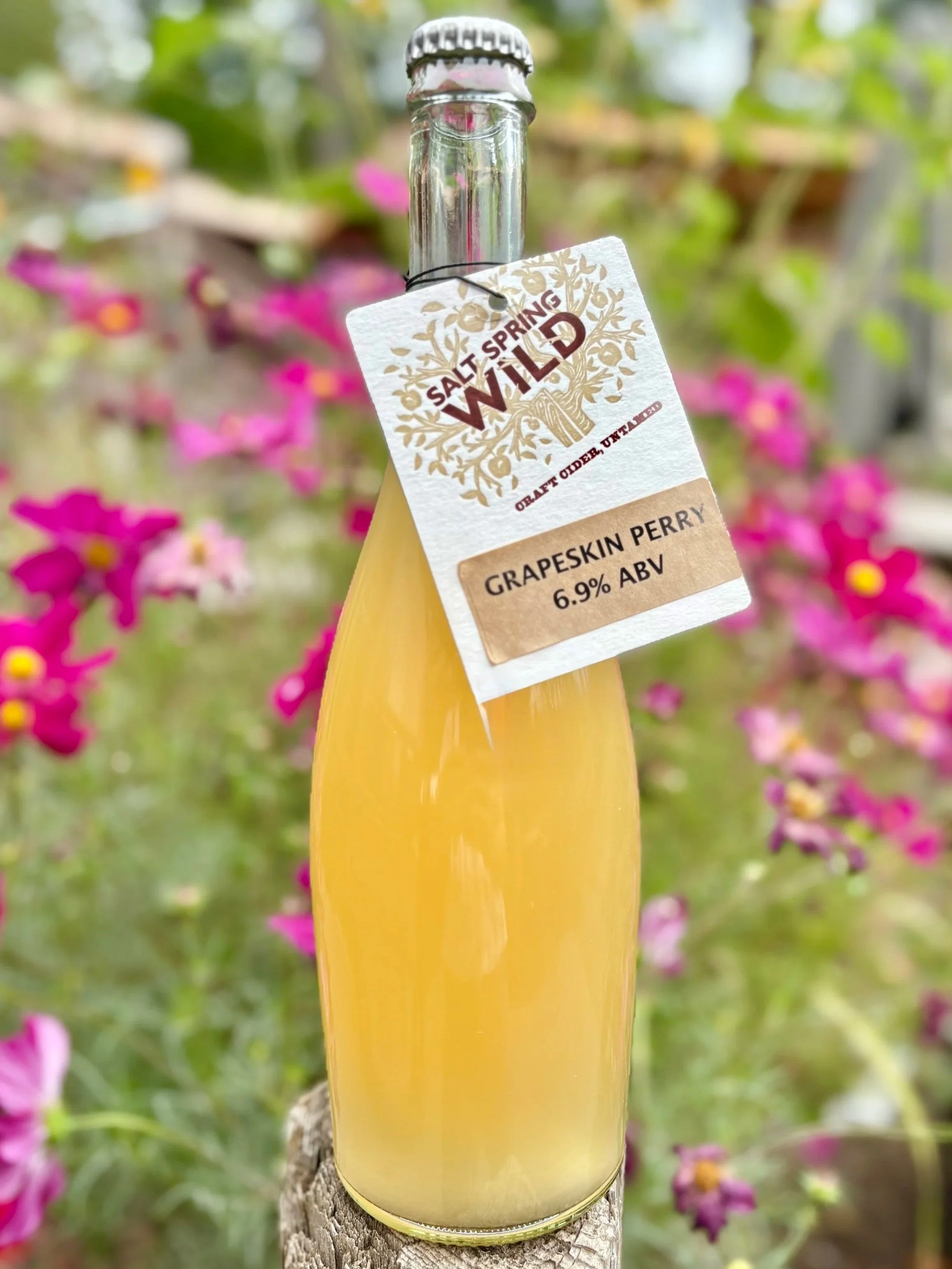Salt Spring Island perry pears were pressed and wild fermented, and then sat on the skins of Siegerrebe wine grapes for one month. Bottle-conditioned to carbonate. Floral nose with hints of lavender and rose; gently sweet and pear-forward, with notes of jasmine green tea and white pepper. 6.9% ABV